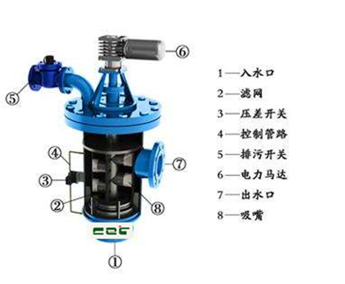 電動吸吮式自清洗過濾器是一種利用濾網(wǎng)直接攔截水中的雜質(zhì),去除水體懸浮物、顆粒物,降低濁度,凈化水質(zhì),減少系統(tǒng)污垢、菌藻、銹蝕等產(chǎn)生,以凈化水質(zhì)及保護系統(tǒng)其他設(shè)備正常工作的精密設(shè)備,水由進水口進入自清洗過濾器機體,由于智能化(PLC、PAC)設(shè)計,系統(tǒng)可自動識別雜質(zhì)沉積程度,給排污閥信號自動排污。