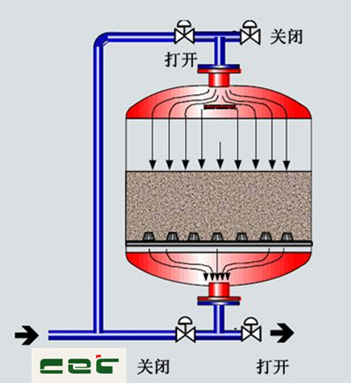 石英砂過濾器筒體內(nèi)以不同粒徑的濾料,從下至上按大小壓實排列。當(dāng)水流自上往下流過濾層時,水中含有的懸浮物質(zhì)流進上層濾料形成的微小孔隙,受到吸附和機械阻流作用,懸浮物被濾料表層所截留。同時,這些被截留的懸浮物之間又發(fā)生“重疊”和“架橋”作用,在濾層表面形成薄膜,繼續(xù)發(fā)生過濾作用。這即是所謂濾料表層的薄膜過濾效應(yīng)。這種薄膜過濾效應(yīng)不但表層存在,而當(dāng)水流進入中間濾料層時也產(chǎn)生這種截留作用。與表層的薄膜過濾效應(yīng)不同的是,這種中間截留作用稱之為滲透過濾作用。